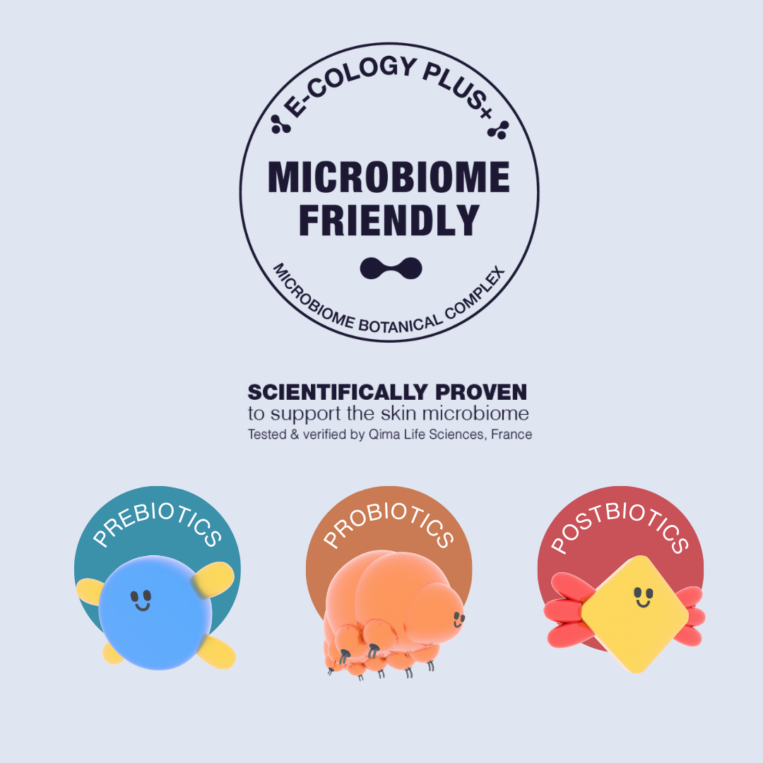 E-Cology Plus+: Builds skin immunity and cares for the skin barrier with certified natural pre-, pro- and postbiotics fortified with durian, mangosteen, aloe vera and hyaluronic acid.